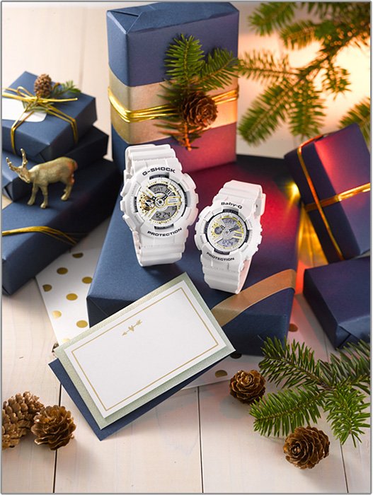 G PRESENTS LOVER'S COLLECTION 2016From G Presents Lover's Collection comes angel-and-devil motif limited-edition Christmas models that also mark the 20th anniversary of this popular series. This is marked by themes and color that are firsts for the models of this series. Base models are the G-SHOCK GA-110 big case model and the BABY-G BA-110 which was inspired by the GA-110. Both models combine various parts into complex patterns. These new models use the same white-and-navy coloring as the original LOV-96-1 model, and they are strongly linked with the angel-and-devil theme of the original model, even though their appearance and shape are different. The G-SHOCK models feature a metal part that represents a devil's spear while the BABY-G models feature an angel's heart metal part. These are intended to represent the inseparable bond between two lovers. Gold coloring is used to commemorate the 20th anniversary of these models. These models come in a heart-shaped box marked with the text, "G PRESENTS LOVER'S COLLECTION 20TH ANNIVERSARY," and drawings of an angel and a devil. The base color of the package is white, with navy blue and gold for the illustrations to match the coloring of the watches. The back covers of these models are imprinted with the figure of an angel and a devil, and the year 2016.
